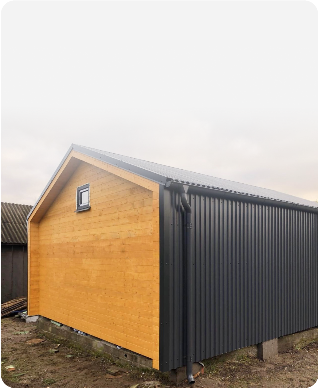 Баня обшита металлом, это обеспечивает долговечность и не требует подкраски.